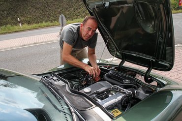 Ahogy ilyenkor lenni szokott, nem minden úgy alakult, ahogy azt szerettem volna. Az autó tulajdonosa, Farkas Zoltán pontosan érkezik, de egyből közli, hogy valami nem kerek, rángat a kocsi. Nem volt ideges, sőt, azt mondta, jó, hogy ez most jött elő és nem a hétvégi versenyen, valahol messze Budapesttől. Zoli rutinos autószerelő, saját műhellyel és veteránversenyekre is jár a GT-vel. 15 éve vette a kocsit Németországban, és vett mellé egy másikat is donornak. Laza négy éve elment rá, hogy olyan kocsi legyen belőle, ami méltó a Parkoló Parádé “Öreg, de rohadt menő” díjára.