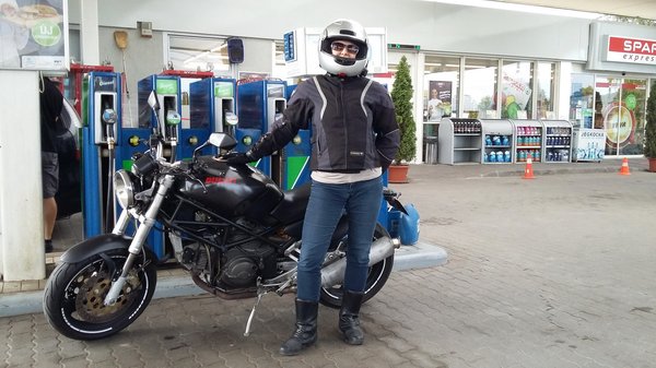 Új motor is lett közben. Nekem a Honda Freeway, amit tényleg csak átmeneti jelleggel vettem, hogy a Spacy-t kiváltsa, amíg kicsit gatyába nem rázom, Katinak pedig a magyar piac legolcsóbb Ducati Monstere, egy régi 600-as. A feleség csak amiatt volt hajlandó ránézni, mert törött volt a motor – fényszóró, tank, ütött első kerék, héblik. Én hoztam haza a gépet Tatáról, műszakilag rendben van, közben már túrázni is voltunk, egynaposat. Kati imádja, állítólag sokkal jobb vezetni, mint a Honda VFR400 K-ját volt. Azzal sose sikerült összemelegednie.