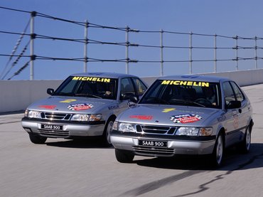 De kijutottam Amerikába is, sokkal hamarább, mint gondoltam. Először a szörnyűséges Sintra bemutatójára (amit alig pár évvel később úgy tüntetett el az Opel a kínálatából, mintha sosem lett volna olyan autójuk), mely alkalommal alaposan átverettem magam egy laptop-vásárlás során egy talán szerb eladóval a Times Square-en, bár mindenki mondta, hogy ott nem veszünk mást, csak kaját, és kicsit levegőt. Aztán rá pár hónapra kijutottam a Saabbal Atlantába, pontosabban pár száz kilométerrel beljebb, Anistonba. A feladat: az akkor faceliftelt 900-asokkal mindenféle Guinness-rekordokat döntögettek épp a Talladega Speedwayen, ami egy olyan versenypálya, mint Daytona, csak egy picit nagyobb és gyorsabb. Alapvetően egy ovál, emelt ívekkel a két végén, de az egyik egyenest pár fokban megtörik, így felülnézetben enyhe pajzs formája van az egésznek. Az emelt ívek azonban nem folyamatos paraboloidok, hanem alul, ha jól emlékszem, 17, utána egy töréssel 36 fokosak – a legmeredekebbek az amerikai versenypályák közül, hiszen Daytonában csak 34 fokosak ezek. Mindenesetre iszonyú magasan van a széle, felmásztam oda megnézni, kész hegy.