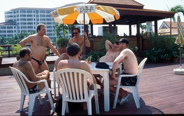Az repülőút Bangkokba vezetett, ahonnan Hua-Hinre vittek bennünket busszal, egy végeláthatatlan sorban teherautó-roncsokkal szegélyezett országúton. Hua-Hin egy kis falu a tengerparton, mellette pedig luxusszállodák sorakoznak – a miénk volt a harmadik. Ingyen adták a koktélokat, volt két hatalmas, formátlan úszómedencénk, egy szuper jakuzzink, illetve lehetett még banánhajózni, jetskizni és pogácsázni is a tengeren. Valahogy túléltük.