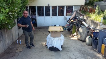 Elfogyott a száraz tisztítószerem is, amit Greenwash Gyuritól nagyjából kétévente szerzek be, ötliteres kannában (csak nekem árulja pőrén, különben csak szolgáltatással együtt jár), épp keddre hozott nekem új adagot, de ott ragadt a XIII. kerületben az autószerelőjénél, mert a furgonjának szétesett a kuplungja – azért is érte kellett mennem. Ráadásként beletörtem a légtelenítőcsavart az istenverte nyeregbe.