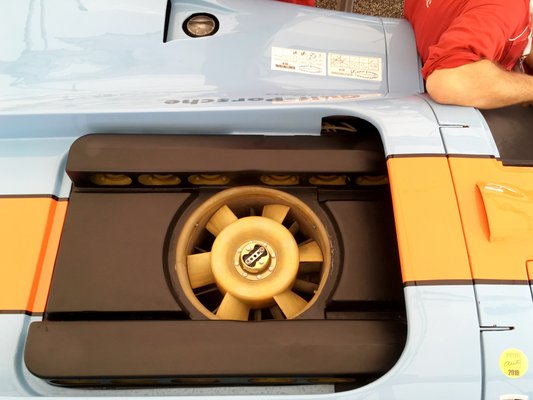 Ugyanazon a soron, ahol a 917 parkolt, a sátor alatt röfögtettek egy 1969-es Lola T70 Mk III B-t is. Meg kell hagyni, az is csinos versenyautó, a V8-as úgy ordít, hogy attól szó szerint megfájdul az ember dobhártyája. A kipufogó végei mögé nyílik a gépháztető – a kiömlő égéstermékek minden gázfröccsre le akarták törni a zsanérokról az egész miskulanciát. Az orra épp nem volt rajta, látszott a szegecselt, alumínium monocoque váz, a filigrán csövekből álló futómű, és persze minden négyzetmillimétere patika tisztaságú, tökéletes volt. De nem ezek miatt esett le az állam.