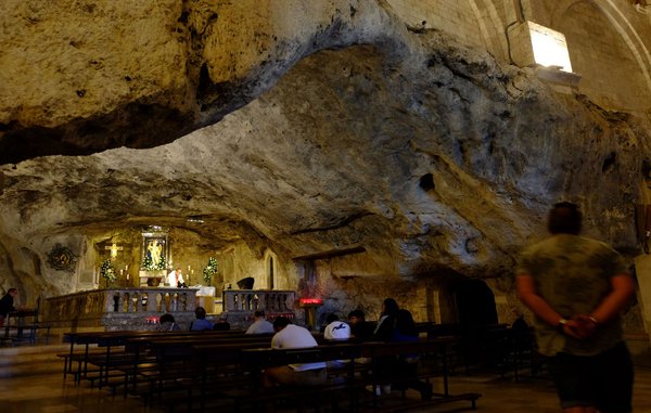 Még mindig barlang, de máshol – még a pugliai út elején, majdnem egy héttel Matera előtt, a mattinatai szállásról (ami meg négyszáz méterre a tenger felett egy szuperkilátásos szuperluxus ház volt) felcaplattunk a Monte Sant'Angelo nevű városkába, amely, mint minden hegy tetejére biggyesztett, régi olasz városka, nyilvánvalóan pokolian hangulatos és zegzugos, de itt van egy spéci templom is.