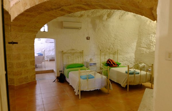 A vicc pedig az volt, hogy a közeli Laterzában éppen egy hasonló barlanglakásban laktunk (ez is airbnb), csak annak jobban kipingálták az elejét, de odabent a gyerekek szobája, mint valami egri vár alatti boros pince, a miénk, beljebb, meg mint egy kicsinyített Aggtelek, kimeszelve. Nagyon állat az ilyen.