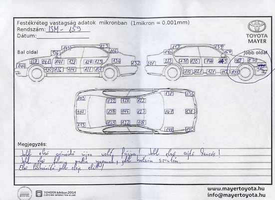 Még egy kis zsonglőrködés – nem is kicsi, mert vagy negyed órát tart – a rétegvastagság-mérővel, s az elemzés végére kiderül, hogy az autón javarészt gyári a fényezés, csak a jobb első elemen vastag a gitt. De milyen vastag! A várható 100-200 mikron helyett 800-1000 mikronokat mutat a műszer, ami azt jelenti, vastag flaszterréteg borítja az egészet. Ez mondjuk, látszik is rajta, mert fény ellenében nézve előtűnnek a csiszolásnyomok, a finom hullámzás a tükröződésekben. Ez egyébként az az elem, aminek az aljánál kicsit eláll a lökhárító is. Nos, ettől még nem megyek falnak, tőlem aztán lehet gittelt, ha nem rohad és nem esik le, nem ezt az autót fogják concours-versenyeken nézegetni a bírák...