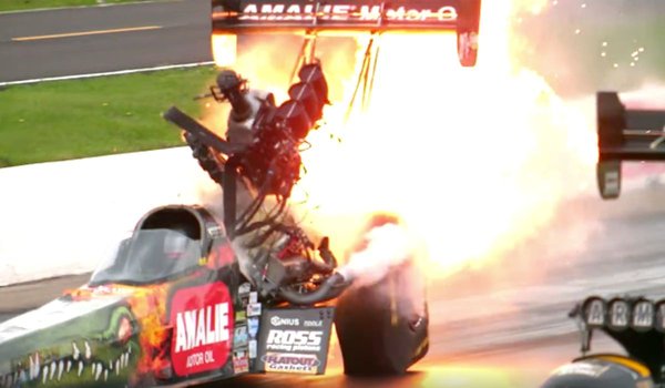 Ez a motor egy Top Fuel dragsteré. Tudják, azok az aránytalanul hosszú, hátul nagy, elöl kicsi kerekű szörnyetegek, amik 0,4 másodperc alatt érik el a százas tempót. A végsebességük karcolja az 500 kilométer/órát, és a sofőrt esetenként akár 8G gyorsulás is érheti, ami már embertelen. És a gyorsulás még csak egy dolog, de ezek a dragsterek gyakran megadják magukat, jellemzően felrobban a motor. Szinte felfoghatatlan terhelésnek vannak kitéve fém alkatrészek, ezért néha elengedik magukat.