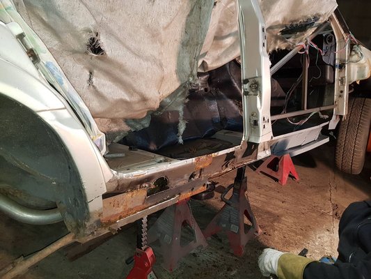 Kint, az akadozó japán wifis neten kezdtek szivárogni az első képek. Az ominózus sarkot úgy, ahogy volt, le kellett vágni. A külső lemez még csak hagyján, azt tudtuk, hogy rossz lesz, de az alsó, amin az emelőbak van, még sokkal rosszabb volt. Még jó, hogy hosszú fakockákkal, a küszöb mellett emeltem a 33-as elejét, amikor a motorját szereltem alulról...