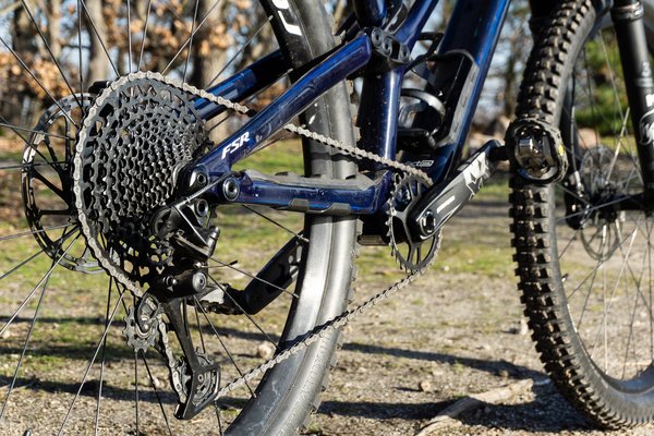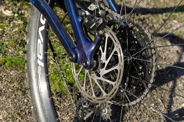 A Stumpy-n ilyen nincs, ez csak simán egy döbbenetesen jól kitalált váz. Elérhető belőle alumínium is, de ez most egy szénszálas változat. Meg mertem volna esküdni, hogy fekete, de amint fény éri, elkezd világítani a kék réteg a lakkozás alatt, az tényleg megállítja a pillanatot. Szép, nem túltolt, ízléses az egész, az aszimmetrikus tagbefogatás meg szimplán menő. A futómű FSR, vagyis a Speci megszokott, fékfüggetlen megoldása, azaz a féknyereg és a hátsó tengely nem a lengővillán, hanem a támvillán kap helyet, így fékezésnél csak minimálisan befolyásolja a mozgást.