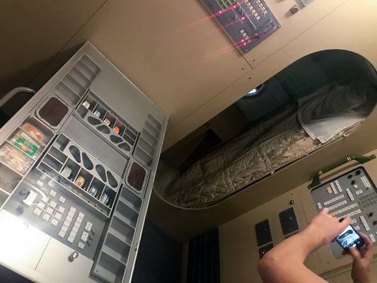 Itt van még a MIR-űrállomás egyik lakómodulja, igaz, ez replika, de be lehet sétálni. Nyomasztó hely, sosem gondolkodtam rajta, hogy is alszanak az asztronauták: függőlegesen. Illetve, földi körülmények között, hiszen az űrben a fent és lent fogalma értelmét veszti, viszont hevederek vannak, amik nem engedik kilebegni a fülkéből az alvó űrhajóst. A vécé egy kisebb tölcsér elöl, egy nagyobb hátul, de van mérleg is a testsúly követéséhez, erre rá kell csapni, és a kipányvázott űrhajós ellentétes irányú elmozdulásából számolják ki a testtömeget. Egy ilyen modul a most fent keringő Nemzetközi Űrállomáson is szolgál, Pável csak annyit mondott, a biciklit sem kell kétszer feltalálni, ha egyszer már bevált, miért ne mehetne fel újra?