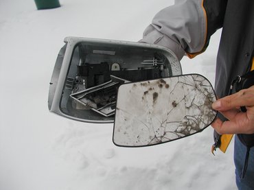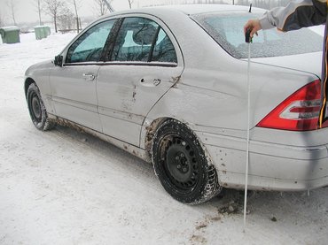 Ez már a domborzattal is rendelkező cseh részen volt, nem is túl messze Prágától. Hogy még jobb legyen a szitu, egy emelkedőn egy balos ívben. Nem forgott sokat a kocsi, de nem tudtam összeszedni: tapadás nem volt, és amikor elértem a szalagkorlát és az aszfalt közötti fű-, illetve most inkább hósávot, végképp elveszett a remény. Az autó nem nagy erővel, de nekicsúszott a szalagkorlátnak a jobb hátulsó sarkával, nagyjából szembefordulva a forgalommal. Ijedtemben annyi jutott az eszembe, hogy villogjak a refivel a sötétben, mert ha most jön valaki, az szétbombáz. Szerencsére nemigen jött autó.