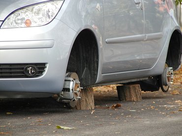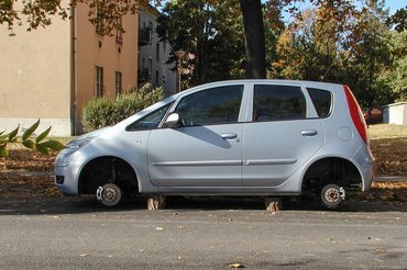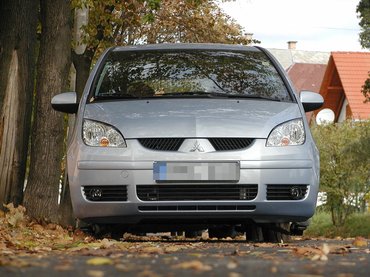 S mivel nem tervezem a „hogyan lopták el a tesztautó kerekeit a ház előtt” témakörű poszt írását sem, azért kárpótlásul még a végére idebiggyesztenék egy szintén kényelmetlen helyzetet. Szegény Colt mellett egyik reggel épp bringával gurultam valahová, amikor nézem, mi a fenétől ilyen alacsony ez? Ja, mert fatuskókon van. Ez kérem profi munka, a négyből három tuskó szinte egyforma magas is volt, de még így is pozitívum, hogy mégsem dobták hasra szegény kocsit. Kezdő keréktolvajoknak mindenképp javasolnám ezt a fajta igényes munkavégzést: