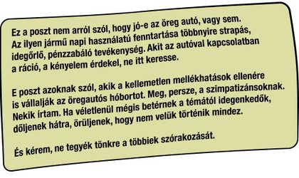 Szóval ott tartottunk, hogy beültem a kormány mögé, betekertem a motort, bezártam a házat, és ahogy szoktam, hazaverettem az M7-esen stabil 90-nel, ami ennek az autónak közel a végsebessége. Ahogy mindig, a motor most is megnyugtatóan vonyított és sivított a hátam mögött, hazaértem, betettem a garázsba, s vártam, hogy Kati 500-asa elkészüljön Frankééknél – ott is függőcsapszeg-javítás és üléstömés-csere volt az elsődleges feladat, aztán kiderült még ötven másik dolog is. Hiába, ha elfoglalt a férj, az asszonyka autója is úszik.