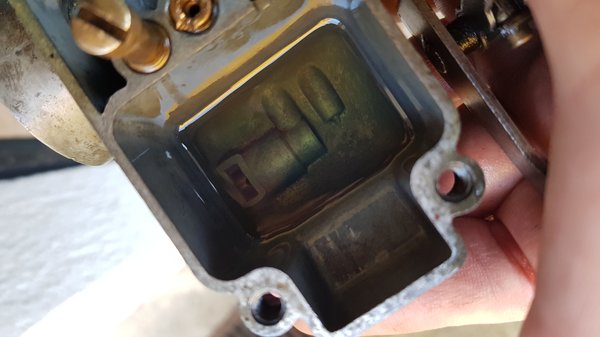 És igen, a fedélben levő előszűrőben sok-sok fekete gumitörmeléket találtam, olyat, amit in situ nem vettem észre. Biztosra akartam menni, ezért atomokra szedtem a karbit, ki és széjjel a fúvókatartókat, ki az úszót, a tűszelepet, annak házát, a kúpos zárású szívatót, a levegőállító csavart, mindent, épp csak darabokat nem törtem le belőle.
