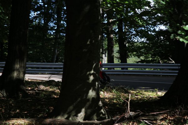 Ez a kép szinte egy feladvány, mert a BMW S 1000 XR egyfelől Waldóként rejtőzik a fák között, ugyanakkor rikító piros színével és a középre komponálással azonnal magára vonja a figyelmet. Ez a paradoxon végig feloldatlan marad, a szemlélő szinte érzi azt a nyugtalanságot, ami az S 1000 RR-ből származó soros négyhengeresből árad. (Exif infó: 1/320, F4, 70 mm, ISO 100)