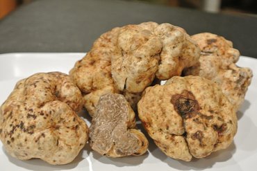 Mire odaértünk, a többiek már kint voltak az erdőben, és szarvasgombát gyűjtöttek. A helyi bácsik kizárólag Panda 4x4 Vanokkal közlekedtek, és a mesékben látható disznók helyett kutyákat alkalmaztak a környéken honos fehér szarvasgomba kiszagolására. A kutya lényegesen praktikusabb jószág, pláne, ha egy Pandával akarod szállítani: be tud szállni daru nélkül, sőt, be is fér. Nagyon hosszú folyamat egy ilyen kutya betanítása (bár gondolom, egy disznóé is), és olyan fajtákat használnak erre, mint a hipoallergén cukiságbomba, az olasz vizikutya. Természetesen én sem emlékszem minden sajtóebéd pontos helyszínére, de a jellegzetes vár képe és az egyik fotón látható útba igazító tábla alapján már könnyen felgöngyölíthető volt, hol is voltunk: a várban rendszeresen tartanak szarvasgomba-árveréseket, ezen a videón is látszik, micsoda pénzek forognak ezen a piacon, és milyen boldogan szagolgatják a hatalmas gombákat gazdagék.