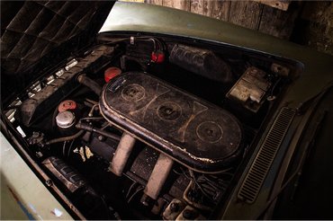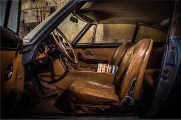 Vastag porréteg telepedett a Ferrarira az eltelt 40 év alatt és a réseken bejutó napfény megette az orráról a fényezést is, de még mindig ott figyelnek benne a gyakran hallgatott kazetták George McCraetől és Percy Faithtől. Igazi pajtakincs, tömény patinával, a régi fekete alapú francia rendszámmal meg a sárga Carello fényszórókkal.