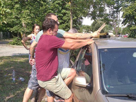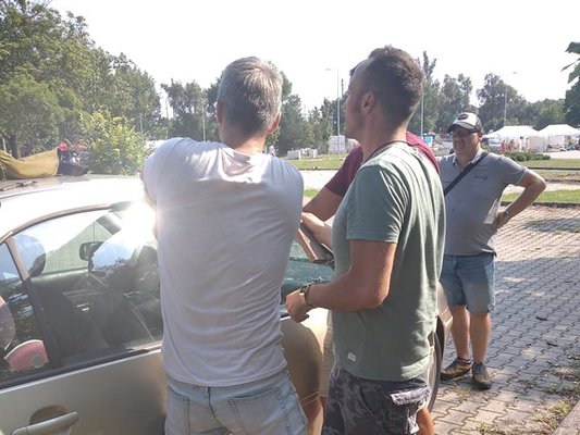 Az időközben az FB-n kiposztolt vészjelzés hatására feltűnik egy Lada klubos kolléga. Amikor kiböki, hogy nem ez lenne az első autó, amit kulcs nélkül kinyit, tisztelete jeléül mindenki egy emberként hátrál egy lépést a Borától. Ő is azonnal levette, hogy bár az ablakkeret felső részének elhúzásával kis rést tudunk ütni az autón, akkorát nem, hogy a kulcscsomót kihúzzuk rajta. Marad a kilincs meghúzása, no, de mivel? Szerencsére valaki szerzett egy vastagabb kerítésdrót darabot. Én egy deszkadarabbal járultam hozzá az események alakulásához, ami alkalmasabbnak tűnt az ablakkeret távoltartásához. Az addig próbált ágakat úgy harapta el az ajtó, mint gyerekek a sós pálcikát.