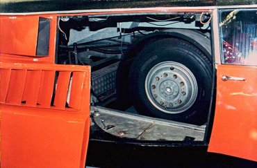 A két motor közül csak az egyik hajtotta az autó Peugeot 504-esből származó három hátsó tengelyét, a másikkal a középen felfüggesztett, tesztelendő kereket hajtjhatták. Ez egy zárt házban foglalt helyet az autó közepén, az első üléssor mögött. A két bent ülőt masszív kerékdobbal védték, hiszen a teherautó-kerekek durrdefektje az alkalmazott 10 baros nagyságrendű nyomás miatt még a személyautókénál is nagyobb kárt tud okozni.