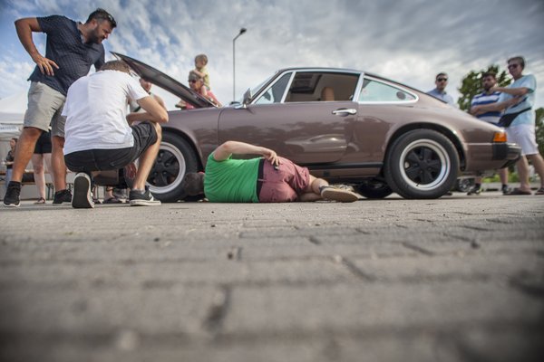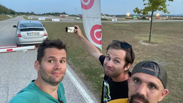 Az én kedvenc képemen nem egy autó szerepel, hanem három holtfárad ember. A nap, amikor a TAP-ot új helyszínre vittük. Pályát sosem raktunk még ki, most is vártuk Ágó Bélát szeretettel, aki viszont reggelre lebetegedett, így nem tudott jönni. Ráadásul közönség is volt, és minél több autót próbáltunk beletuszkolni a napba, ezért szünetet sem hagytunk csúszásra. Szerencsére a közönség nagy része bulinak fogta fel az egészet, segített bóját cipelni, ívet kirakni, így csak másfél órás csúszást sikerült összehozni az első forgatás kezdetére. Az első vendég Kiss Norbi volt, és időpontra ment egy másik helyre, úgyhogy rohantunk, ahogy tudtunk. A drón teszt nélkül futotta az első felvételt, így nem is lett meg az első kanyar rendesen, a sokkal nagyobb pálya miatt az egyik operatőr nem ért vissza a célhelyre az első kanyarból, így nem volt befutónk onnan. De végül mindenki akaratának és lelkesedésének hála összeállt az új TAP, és a nap végére behoztuk a csúszást. Ja, mondjuk ebéd időnk nem lett, pedig volt tervezve. A kép a nap végén készült, amikor lement minden autó, mentek a vendégek is két jutalom kört, és összeszedtük a bójákat. Szerintem látszik rajta, ki mit gondolt az aznap történtekről.