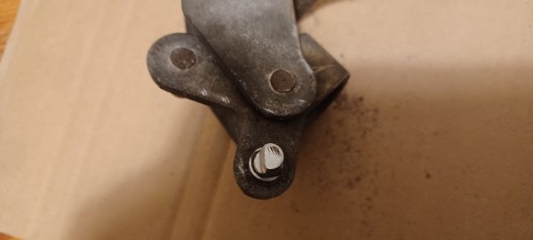 Szóval ezzel az egységgel volt a gond, az ezen lévő egyik gömbfej végét húzkodjuk a bowdennel, amikor jobbra-balra mozgatjuk a váltókart. Itt egy csapszegen van egy műanyag kocka, ami egy nútba megy bele a rudazaton, ezáltal cincáljuk ki és be a rudazat tengelyét. Belátható, hogy ha ez a kocka elfogy, akkor holtjáték keletkezik, ezért a bowden változatlan hossza miatt kevésbé tudjuk mozgatni ki és be az egész rudazatot. Ami pedig itt egy néhány mm-es holtjáték, az a váltókarnál már sok centit jelent. Nálam már nemhogy a kocka, de a csap is félig elfogyott, amikor egyszer érdekességképp kivettem, hogy ránézzek.