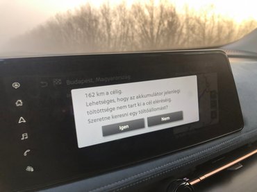 Ekkor meguntam, és útnak eredtem visszafele, miközben a kíváncsiságból belőtt gyári navigáció sikoltozott, hogy nem lesz elég a nafta. Ez csak azért volt furcsa, mert közben az autó azt állította, hogy bőven elég, olyan 60-70 km-rel végzek. Nyomozni nem volt idő, tippre be lehetett állítva a naviban valami ráhagyás, hogy legyen még esély tankolni. Szóval egész jól lehet már villanyközlekedni, de a valós gyorstöltők nagyon kellenek, és az se lenne baj, ha a meglévők is jól dolgoznának együtt az autókkal. Egyébként máshol azt írják, hogy a hideg akku okozhatta a jelenséget. Amúgy az autó elő tudná melegíteni, viszont csak kézzel, menüből kapcsolható a funkció, így jó eséllyel sokan el fogják felejteni (ha egyáltalán tudnak róla).