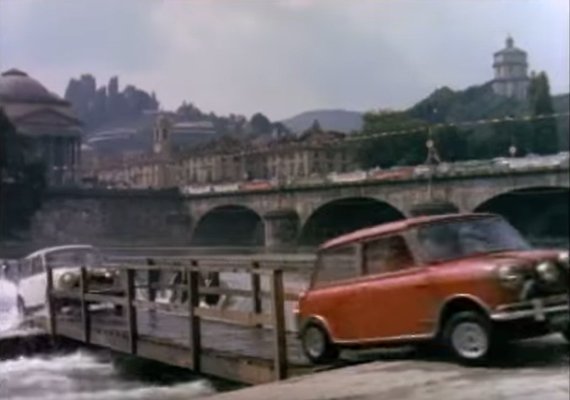 A következő vágás igazán meglepett. A három Mini a "mélygarázsból" mindenféle átmenet nélkül egy ház tetején tűnik fel - hogy hogyan kerültek oda, ne firtassuk. Legalább miközben tetőről-tetőre ugratnak, megcsodálhatjuk a háttérben feltűnő olasz feliratokat. Micsoda egy világváros ez a Budapest!