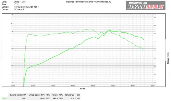 Szóval a keréken mért teljesítmény a jellegéből adódóan nem lehet tökéletesen pontos érték. Mindig van pár százaléknyi bizonytalanság. Szóval lehet, hogy ez az autó 144 lóerős? Nem valószínű, mert széria motortól nem láttunk még ennyit. Ugyanakkor pedig de, lehet, ezen a padon simán ennyi. Ez egy tájékoztató jellegű adat, ha ebbe beleveszünk pár százaléknyi eltérést, akkor is nagyon jó erőben van az autó, úgyhogy ezzel a direktszűrővel és az üvöltő kipufogóval még az is lehet, hogy túlszárnyalja a Toyota által megadott értéket.