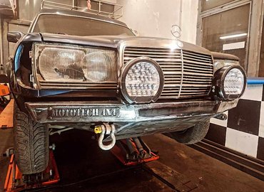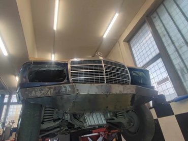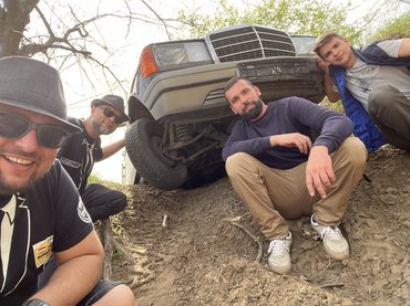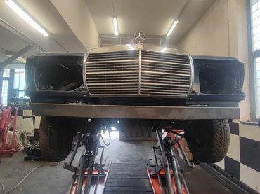 A nyúlványt még keményebb munka követte, Levente éjt nappallá téve mért, vágott, mért, kalapált, heftölt, köszörült, hogy az év első Parkoló Parádéjára alakot öltsön a front. Sajnos a W123 kartere hosszan nyúlik a föld felé, ez az autó legalacsonyabb pontja, ráadásul a legelejében kapott helyet. Talán nem is kell ecsetelnem, hogy ez mekkora kockázat sziklás tájakon nagy tempónál, ahol ha véletlenül odacsapjuk, azonnal törik és a motor kuka. Tehát ezt védeni kell, akár az életünk árán is, ezért nem volt elég a dögterelő, lámpatartó lökhárítót összehozni, hosszan nyúló haspáncél is kellett.