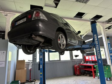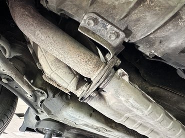 Próbáltuk megoldani a kipufogó kifújását is, de elsőre nem jártunk sikerrel - a leömlő és a középdob közötti csőcsatlakozás közötti tűzkarika tűnt nagyon fáradtnak, érezhetően ott szivárgott a rendszer, ezzel kellemetlen szagokat juttatva az utastérbe is: háromból két csavar oldott, mint a kisangyal, a harmadikat csavartuk, melegítettük, hidegvágtuk, de nagyon rossz helyen volt és a felismerhetetlenségig elrohadt, így végül az amatőrség és a tompa szereldmagados fúrószárak miatt nagyjából fél óráig csak fúrtuk és fúrtuk, mire lejött. Találtunk bele egy másik csavart, kicseréltük, és láss csodát, természetesen csak jobban kifújt, mint előtte, mindkét felén annyira el van vékonyodva az anyag, hogy valószínűleg egy teljesen új csatlakozást kellene gyártani, ami a mi kompetenciánkat és eszköztárunkat egyaránt meghaladja, de van már terv a megoldásra.