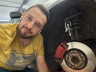 Szerelés közben megállapítottam, hogy előttem már valaki járt erre, és elég szép munkát végzett: frissen festett és dugattyúcserélt féknyergek, alig párezer kilométert futott tárcsa és betétszett, fémhuzalos flexibilis fémcsövek, új stabilizátorpálca – már vásárláskor is feltűnt, hogy ezt az autót szerették, és költöttek is rá, de hogy ennyire intakt minden, az csak a kerék levétele után állt össze teljesen a fejemben.