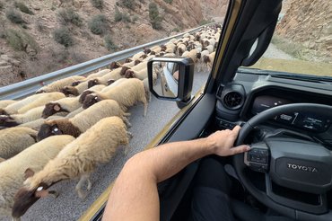 Berber falvakon, településeken és tanyákon keresztül vezetett a Toyota Land Cruiser tesztútja, nem rejtettek el előlünk semmit. Kutyák és macskák, különböző változatos haszonállatok között kellett sokszor manővereznünk a nagy testet, ezért nem egy olyan fotó készült, ahol birkák vesznek körbe. Telefonnal készült az egyik kedvencem, amivel el tudtam hozni magamnak egy pillanatot abból, milyen egyrészt a Land Cruiser hangulata, másrészt a helyi állattartás. A szűk hegyi úton mi lefelé, ők fölfelé érkeztek, pásztorukkal összebiccentettünk, mintha elnézést kérne, de valójában én voltam az ő mindennapi munkájának útjában, úgyhogy töredelmesen megvártam, míg elbégetnek mellettem.