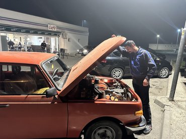 A próbaútról visszaérve még mindig stabil alapjáraton pöcögött a kovácsoltvas kapu előtt a kocsi, és mivel tényleg jónak érződött menet közben is, rövid alkufolyamat után kéz a kézbe csapott, és éppen sötétedés után el tudtunk indulni haza. Az eladó persze enyhén hangnemet váltott, és jelezte, hogy az elmúlt pár évben javarészt állt a Wartburg, és talán összesen nem ment annyit az előző műszakija óta, mint amennyire mi most készülünk, de jó utat kíván. Jó is volt az út az első benzinkútig, ahol megvettük az autópálya-matricát, mondván, kamion mögött, 90-es tempóval még mindig jobb, mint mellékutakon át a fél országon, 100-as benzin keveredett 2T olajjal, addigra a gyári fűtés szinte szaunát csinált odabenn, hibának nyoma sincs, az ár pedig tényleg szemtelenül alacsonynak tűnt, a boldogsághormonok platóján ilyenkor még a benzinkutas csokit sem kívánja az ember. Körülbelül 5 kilométer múlva kezdett rángatni a motor.