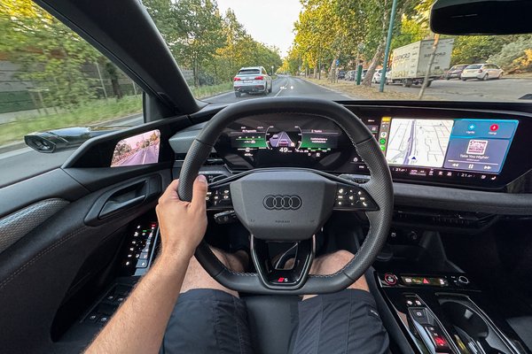 Ülök ebben az A6-ban és rendesen golyózik a szemem a kijelzők között. Reflexből kinézek a tükörre, konstatálom, hogy az csak egy amorf csonk egy csöpp kamerával, majd keresni kezdem a belső kijelzőt. Bent van az ajtókárpit felső élén, olyan 20-25 centivel beljebb és 10 centivel lejjebb, mint a külső tükör lenne. Elvesztem a periférikus látásom élességét és még bele is zavarodom a kijelző képébe, mert a baloldali egyáltalán nem felém néz. Ezt mégis hogy gondolták? Persze, így adja ki a műszerfal dizájnja, de kábé 45 fokos szögből ránézni egy monitorra akkor is frusztráló, ha egy tévéről van szó. A másik még oké, síkban nagyjából merőlegesen felém áll.