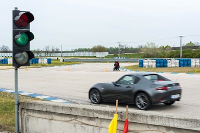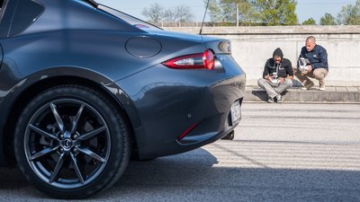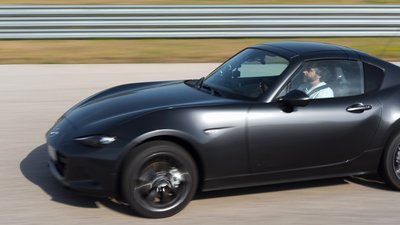 Így, a "Meteor szürke" szín, a tűző nap és a padlógázon teljesített célegyenes kombinációjában egész komolyan néz ki a kis MX-5 RF.