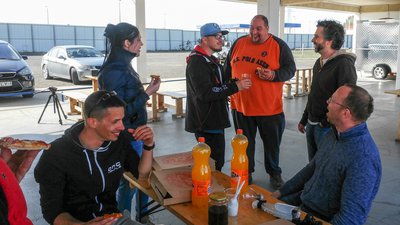 Következő menetrendi pont: vissza a boxutcába, készülődés a benti "vaker" azaz beszélős felvételekre. A két GoPro és hangfelvevő kütyük nem választható extrák egyik autóhoz sem, így ezeket be kell imádkozni a szűkös helyre.