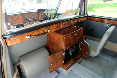 Nem Phantom, hanem egy kisebb, de még így is hatalmas (és emiatt legalább jól vezethető) Rolls, egy Silver Cloud III LWB (azaz tíz centivel megnyújtott tengelytávú verzió). 1955-től 1966-ig gyártották, ez egy 1963-as modell. Sosem restaurálták, csak a küszöböt javították rajta, valamikor a régmúltban. Eredeti, patinás, rendkívül hangulatos darab