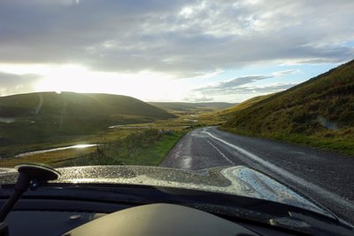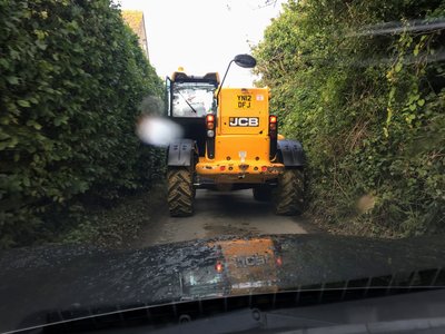 ...támadt ez a kisebbfajta nehézség az úton. Nagy-Britannia tele van ilyen sövényfalak között futó, három méter széles utacskákkal, melyek közös jellemzője, hogy kétirányúak, és egy hét gyakorlás után is megáll a szíved, ha szembe jön rajta egy Daewoo Matiz. Ez nem egy Daewoo Matiz.