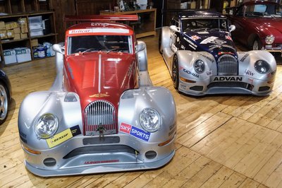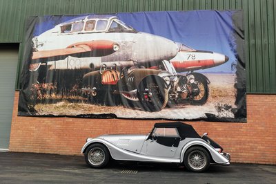 A gyár két alapterméke a háromból. A poszteren a világháborús repülőgép-paródia 3-Wheeler, alatta a Classic termékskála közepén ülő Plus 4. 1936 óta gyártják, 81 (nyolcvanegy) éve, ugyanitt, ugyanígy.
