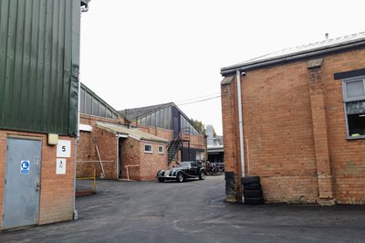 Aztán megérkeztünk, isten segedelmével. Ez itt a gyár udvara. Száznyolc (108) éve áll itt, Malvernben. Azóta egyhuzamban a Morgan család tulajdona, sose adták el. Időnként kapnak pár millió fontot az angol államtól, fejlesztésre, azt megköszönik az adófizetőknek (tényleg, nekünk is megköszönték), és cserébe le is nyomták a várakozási időt szűk egy évre.