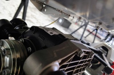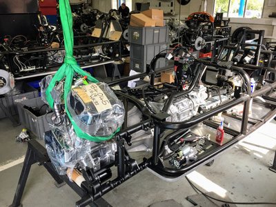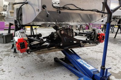 A kardán mögött Quaife végáttét és szöghajtás, onnan meg vaskos szíj az egy darab hátsó kerékig. Bill szerint zseniálisan tudja a driftet és a három kerékkel finoman sodródást is. Fél tonna üresen. Én Spitfire-festéssel kérem a sajátomat, jól megy majd a konyhába.