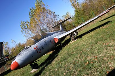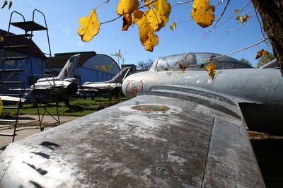 Egy MiG-15 UTI nyújtóztatja szárnyát a sárguló őszi falevelek alatt.