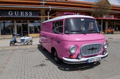 Kevés feltűnőbb jelenség létezett tegnap az egész parkolóban ennél az atom rózsaszín Barkasnál, a háttérben egy Vespához képest egészen szürke és kissé csúnyácska darab tompította a vizuális sokkot
