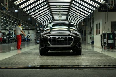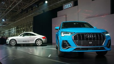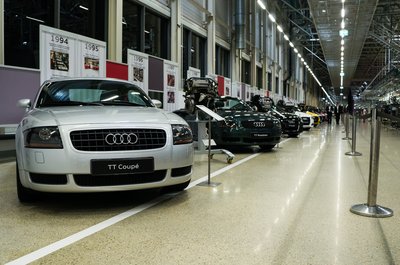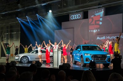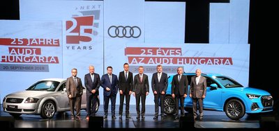 1998-ban autógyártással bővült a paletta, az első generációs Audi TT gyártását kezdték meg. A képen felsorakoznak az eddig Magyarországon összeszerelt autók: Audi TT-k és A3-asok különböző generációi és modellváltozatai. 2018-tól már a Q3 is itt készül
