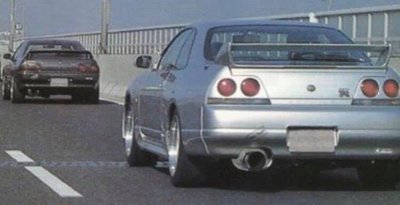 Egy Toyota Chaser és ez R32-es Nissan Skyline driftel békés egyetértésben