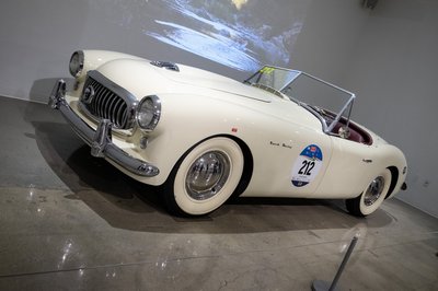 1951-es Nash-Healey sportkocsi, 125 lóerős, sorhatos motorral. Ahogy a kiállítási táblán szerepel: "...ez biztosította, hogy Amerika vezető szerepben maradjon a háború utáni, nagyteljesítményű sportkocsik piacán". Hát... Szerintem többen emlékeznek a Jaguar XK120-ra, Triumph TR2-esre, MG TC-re, de még az Allardokra is, mint erre a 104 példányban készült csodabogárra. Amihez mellesleg az első évben az angol Panelcraft, a maradék háromban az olasz Pinin Farina készítette a karosszériákat, a futómű-fék pedig szintén angol volt benne. Csak a motor és a váltó jött a Nash-től, nehéz is volt, mint a dög