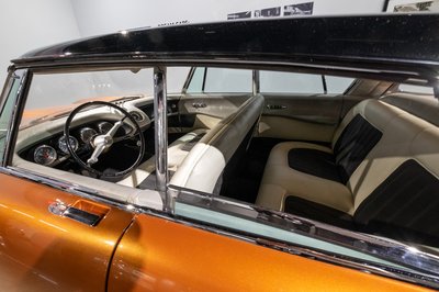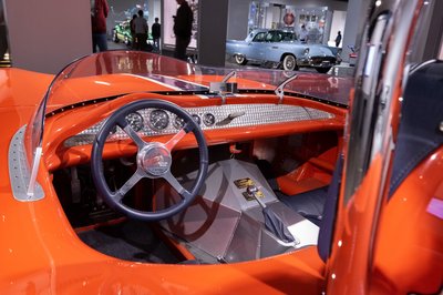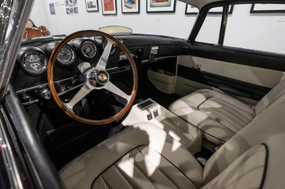 Bőr, króm, alumínium, háromküllős fakormány mellkastörő középső dísszel - minden,ami az ötvenes évek közepén egy drága európai sportkocsi kelléktárába tartozott, még ha ez amerikai is. A rádió gombjai rejtettek