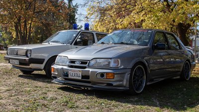 Ford Sierra RS Cosworth. A kaliforniai rendszám furcsa, de mindegy is, hisz ez nem gyári amúgy sem. Az a Golf rendőrautó biztos nem érné utol, ám így is remek darab