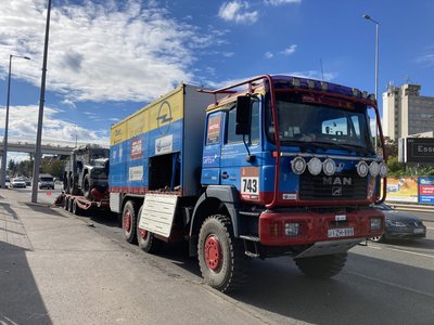 A Veterán Autó Kft. telephelyére a versenycsapat kamionja vontatta el a filmes kelléket.