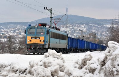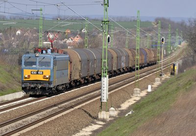 V63-as sorozatú villanymozdony által vontatott tehervonat kapaszkodik fel a baracskai dombokra