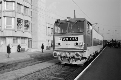 A V63 015 pályaszámú Gigant villanymozdony vontatta szerelvény várakozik a Pécs-Budapest vasútvonalon